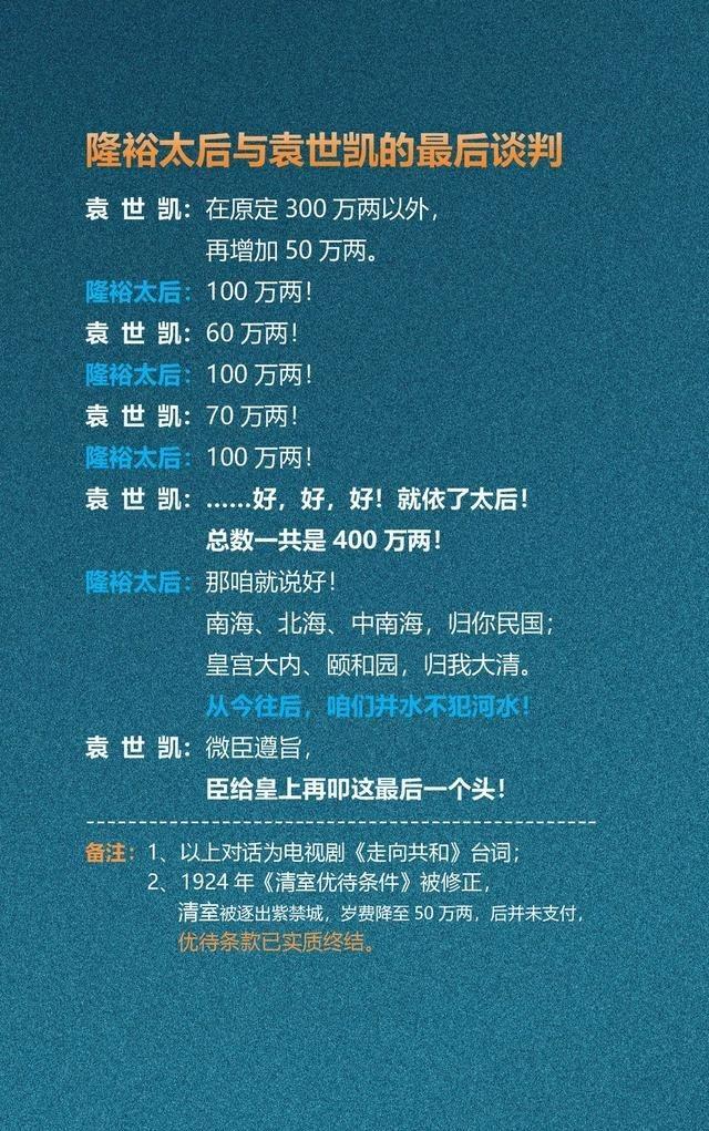 隆裕太后与袁世凯的终末谈判《走向共和》再现了清室退位前的谈判:太后绝不让步,袁世凯步步退缩,最终以400万两岁费成交。而历史上,所谓“强横分明”,不外十余年便被窒碍了。