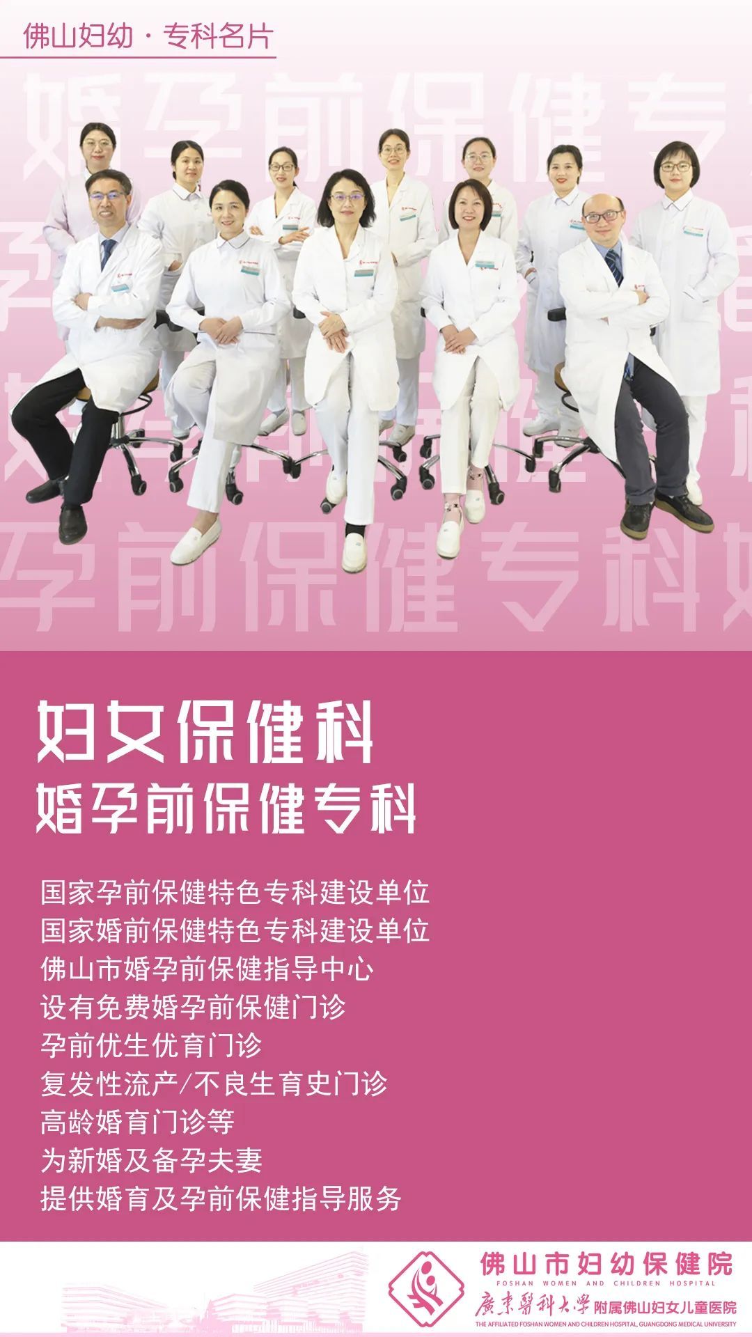 妇女保健科婚孕前保健专科在2023年获批国度卫生健康委妇幼司第一批国度孕前保健特色专科拓荒单元,2024年获批国度婚前保健特色专科拓荒单元,是佛山市婚孕前保健交流中心,多年来,竭力于为新婚及备孕匹俦提供专科的婚育及孕前保健交流服务。