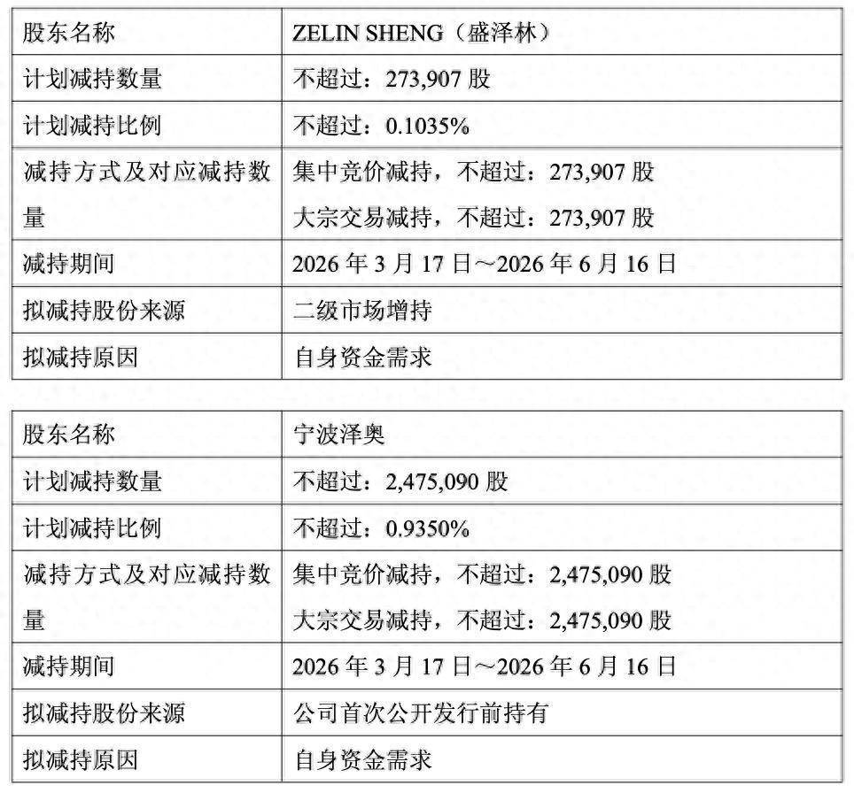 泽璟制药2月13日公告,公司近日收到ZELIN SHENG(盛泽林)、宁波泽奥别离出具的《股份减捏谋划见知函》,因自己资金需求,ZELIN SHENG(盛泽林)拟通过联结竞价或巨额交游面目减捏公司股份数目不卓绝27.39万股(ZELIN SHENG(盛泽林)于2022年3月3日至7月18日历间通过上海证券交游所联结竞价交游面目增捏的股份),即不卓绝公司总股本的0.1035%;
