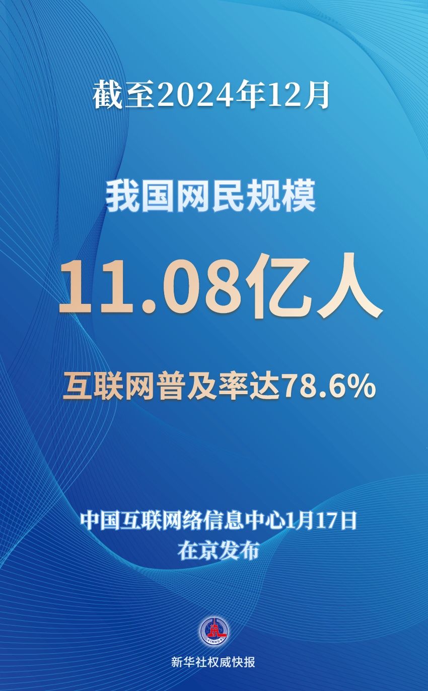 中国互联聚集信息中心1月17日在京发布第55次《中国互联聚集发展现象统计讲述》。讲述清醒,扫尾2024年12月,我国网民规模达11.08亿东说念主,较2023年12月增长1608万东说念主,互联网普及率达78.6%。